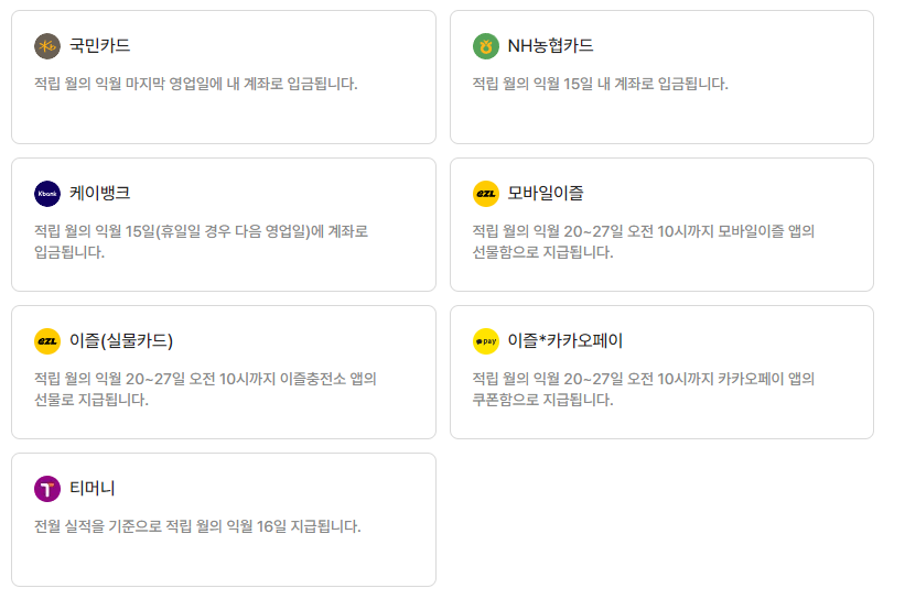 정해진 날짜에 지급되는 카드사 : 국민카드, NH 농협카드, 케이뱅크, 모바일이즐, 카카오페이, T머니