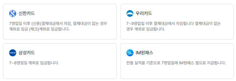7~9 영업일 이내 지급하는 카드사 : 신한카드, 우리카드, 삼성카드, IM원패스